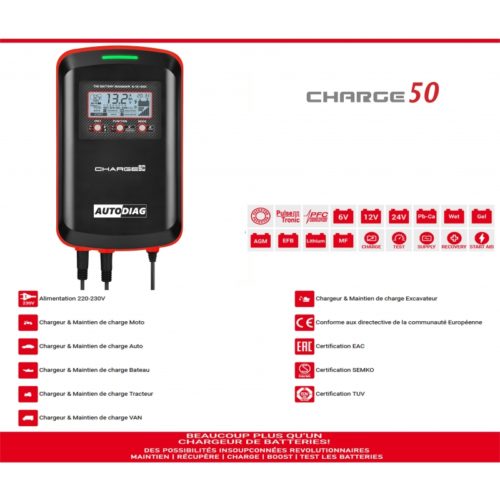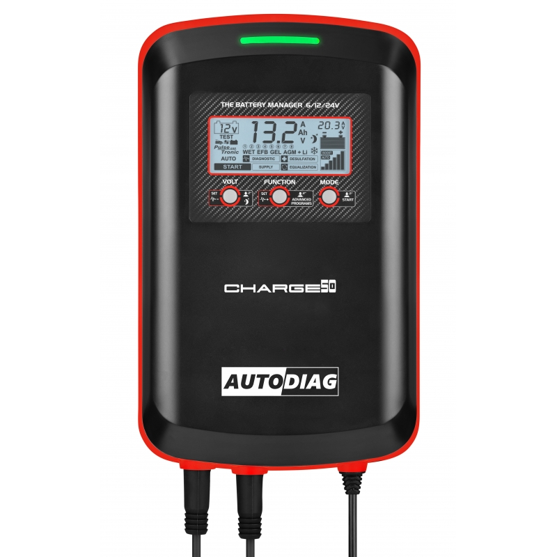 CHARGE 50 est un chargeur – Maintien de charge (50 A) de technologie inverter pour une maintenance totale des batteries de type WET, GEL, AGM, MF, PbCa, EFB, Li prenant en charge des tensions allant de 6/12/ à 24V.CHARGE 50 sera votre meilleur allié et vous soutiendra dans tous les types d’interventions sur les véhicules dans les ateliers, les locaux des concessionnaires automobiles, les Showroom et exposition de véhicule, Tous les garages en tous genres, les ateliers de reprogrammation d’ECU, les spécialistes de la réparation électronique etc…